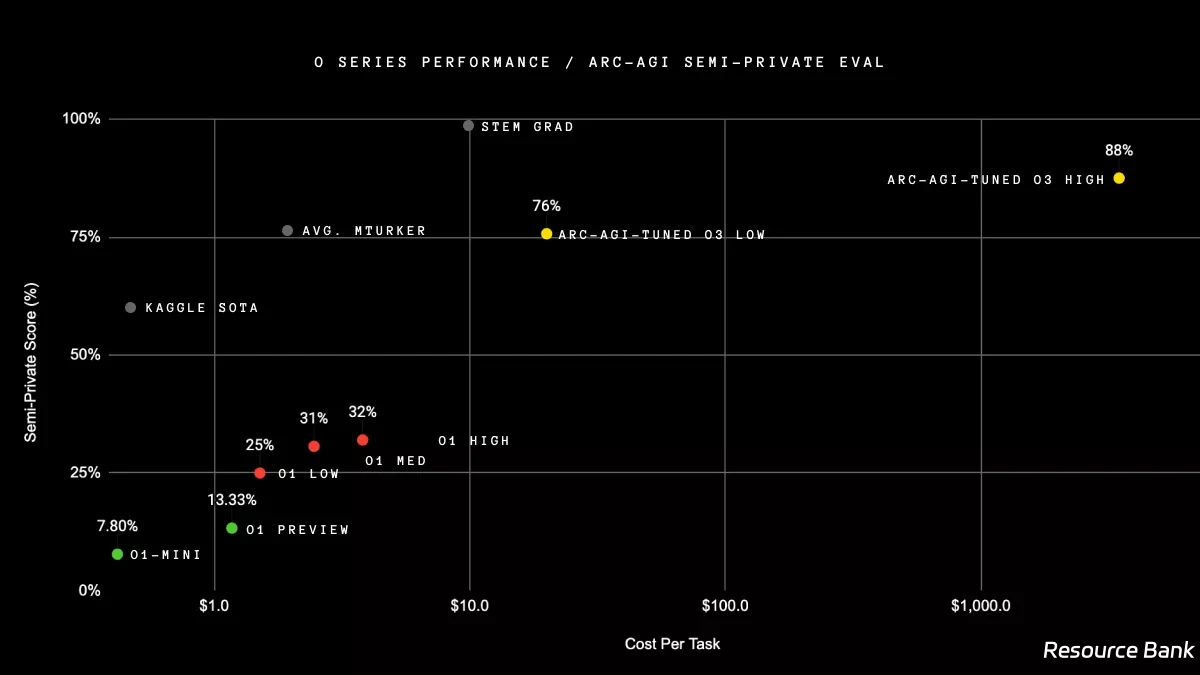 - 抽象推理: 在ARC-AGI的测试中,O3的得分高达87.5%,远超以往模型的表现,接近人类的阈值85%。这一成绩使O3成为当前最具潜力的AGI候选者之一。