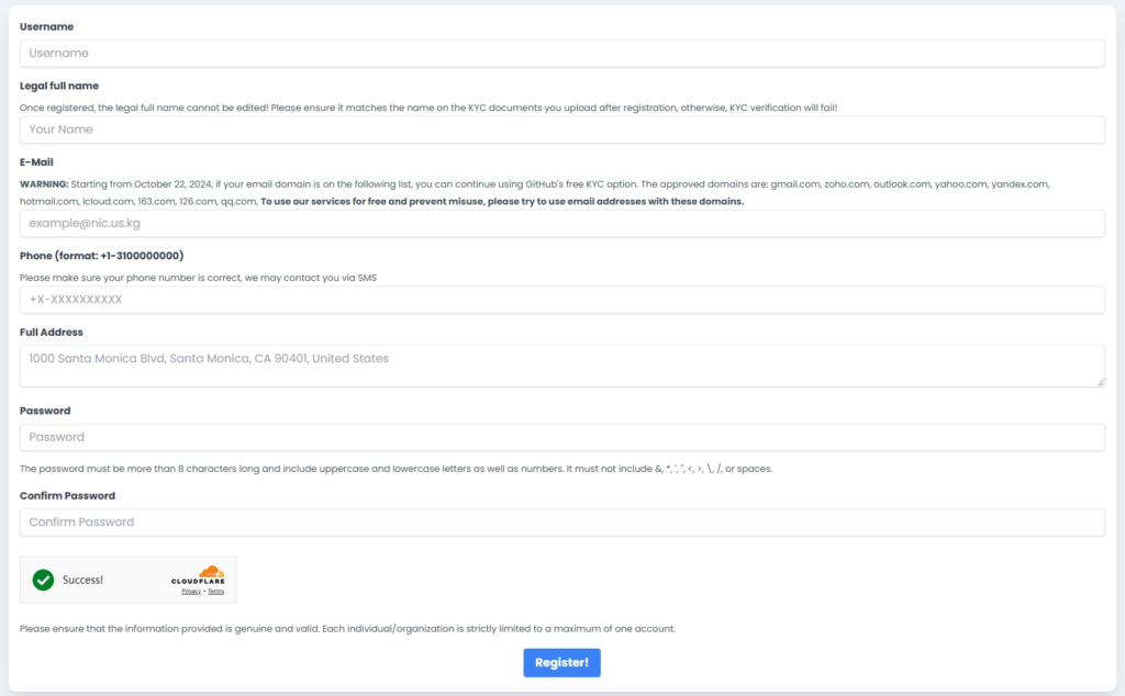 US.KG是由来自美国加州的非盈利组织DigitalPlat赞助的网站,提供免费的yourname.us.kg二级域名,该域名已经加入域名公共后缀列表(PSL),可托管在包括 Cloudflare在内的多数免费域名DNS解析服务商。US.KG默认每个账号可以免费注册3个二级域名,如果不够用可以联系他们有理由增加,注册有效期为365天,到期前180天内可免费续期。特别注意,”上传KYC文件“认证方式已经失效,现在需要准备Github账户,经验证也可以是新注册的账户。