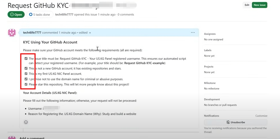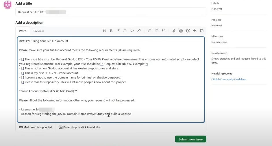填入Username,和Reason for Registering the _US.KG Domain Names(Why),点击Submit new issue
